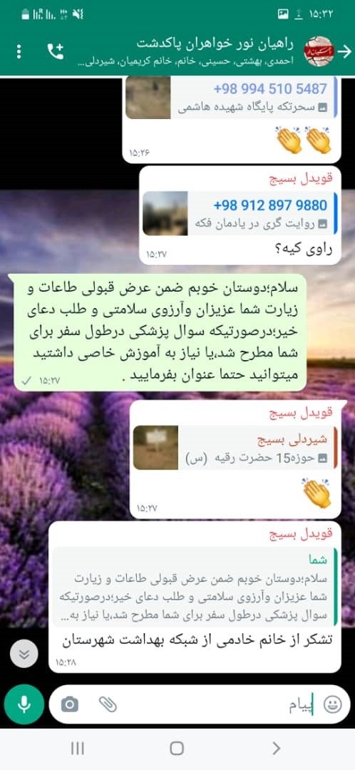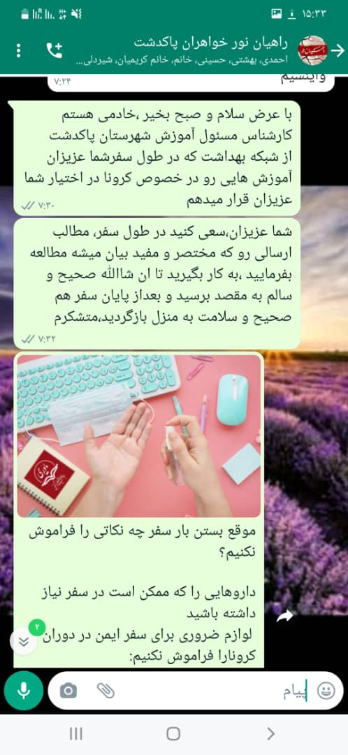 جمعه 27 اسفند 1400 و با توجه به وقفه ۲ ساله سفرهای راهیان نور ، کربلای ایران زمین دوباره پذیرای کاروانهای راهیان نور از سراسر کشور است . با توجه به اینکه پاندمی کرونا هنوز مخاطره آفرین است اهمیت توجه به حفظ سلامت زائران در شرایط کرونا از اولویت های بهداشتی آموزشی می باشد. واحد آموزش و ارتقای سلامت شبکه بهداشت و درمان پاکدشت با تشکیل گروه های مجازی آموزشی جهت زائرین ، پیام های سلامت در زمینه بیماری های سفر از جمله : اسهال مسافران و راههای پیشگیری کرونا و پیام های مرتبط با سوانح و حوادث ترافیکی را به صورت روزانه در گروه های مجازی تشکیل شده با همین منظور و برای زائزین راهیان نور ارسال می دارد . همچنین با امکان ایجاد شده در گروه هریک از اعضا که سوالی داشته باشند می توانند با طرح آن در گروه از مشاورین حاضر کمک بگیرند .