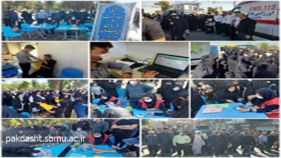 طی مراسم  خدمات واکسیناسیون کرونا ، غربالگری فشارخون و قند خون به عزاداران انجام و بروشور های آموزشي پیشگیری از التور ، آنفلوآنزا و بیماریهای تنفسی و رعایت شیوه نامه های بهداشتی در سفر و همچنین آموزش ها در راستای حمایت از خانواده و جوانی جمعیت توزیع  گردید.  همچنین با توجه به لزوم رعایت شیوه نامه های بهداشتی در پیشگیری از بروز کرونا در تجمعات به عزاداران فاقد ماسک به صورت رایگان ماسک اهدا شد .