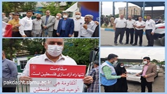 جمعه 9 اردیبهشت ۱۴۰۱ و همزمان با یوم الله قدس ،تیم اورژانس شبکه بهداشت و درمان پاکدشت با حضور پرشور در راه پیمایی به مناسبت همین روز ضمن اعلام انزجار از رژیم کودک کش اسرائیل آماده خدمت رسانی به مردم شریف شهرستان که در راه پیمایی حاضر شده اند بودند . همچنین کارشناسان بهداشت محیط شبکه بهداشت و درمان پاکدشت با حضور در راه پیمایی چگونگی اجرای شیوه نامه های بهداشتی را ارزیابی نمودند .